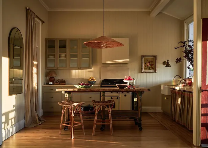 Les équipements de cuisine des propriétés The Homestead At Ballandean Lodge comprennent une cafétière/théière électrique, un réfrigérateur et de la vaisselle, fournis dans un coin repas.